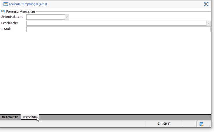 Mit diesem Container können Sie einen Datensatz aus einer dynamischen Bedingung aktivieren oder deaktivieren. Durch Deaktivieren eines Eingabefeldes wird dessen Bearbeitung verhindert. Das folgende Beispiel veranschaulicht die Aktivierung von Eingabefeldern über den Wert des Feldes "Geschlecht":