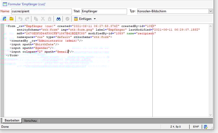 Die Beschreibung eines Formulars ist ein strukturiertes XML-Dokument, das die Grammatik des Formularschemas anwendet: xtk:form.