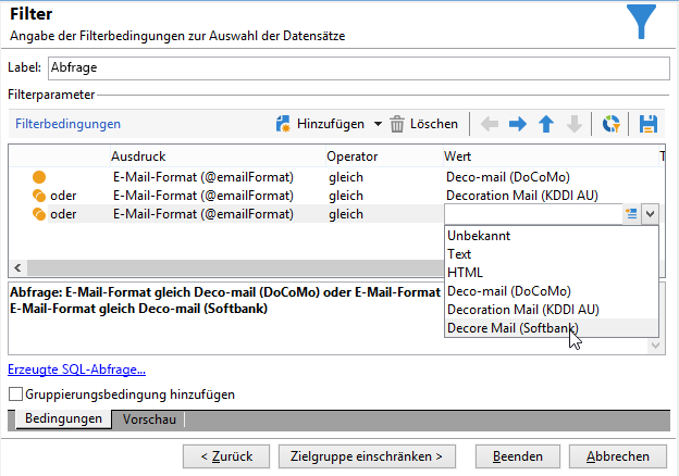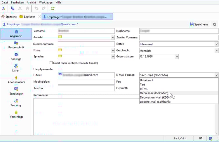 Damit ein Empfänger, der eines dieser Formate verwendet, Nachrichten korrekt angezeigt bekommt, wird empfohlen, das entsprechende Format Deco-mail (DoCoMo), Decore Mail (Softbank) oder Decoration Mail (KDDI AU) im Empfängerprofil auszuwählen: