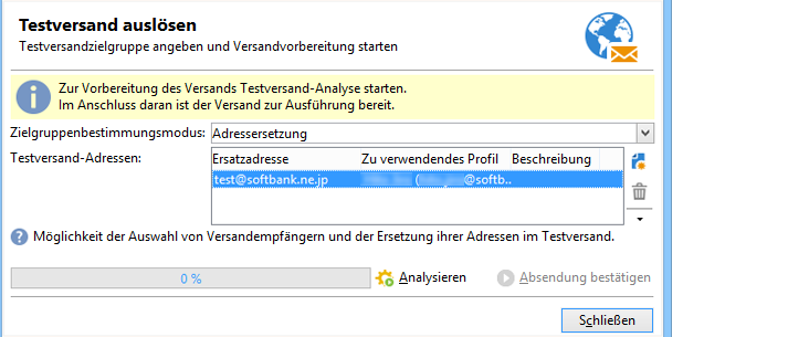 Sie können Testsendungen durchführen, um Ihren Versand zu testen. Wenn Sie dabei Ersatzadressen verwenden, geben Sie bitte die Adressen ein, die dem E-Mail-Format des verwendeten Profils entsprechen.
