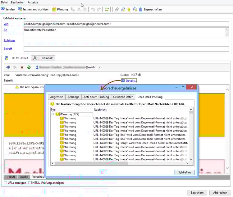 Verwenden Sie hierzu im Vorschau-Tab des Fensters zur Inhaltsbearbeitung den Link Details…> Deco-Mail-Prüfung. Hier können Sie: