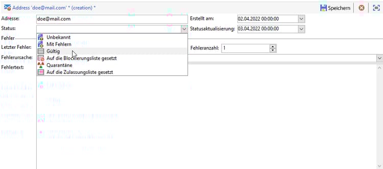 - Adressen mit dem Status Fehlerhaft werden nach einem erfolgreichen Versand aus der Quarantäneliste entfernt.