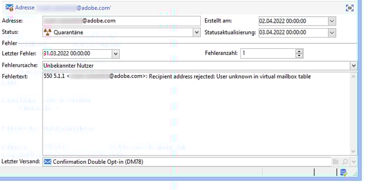 Bei Adressen in Quarantäne zeigt das Feld Fehlerursache an, was die Quarantäne ausgelöst hat. Weitere Informationen.