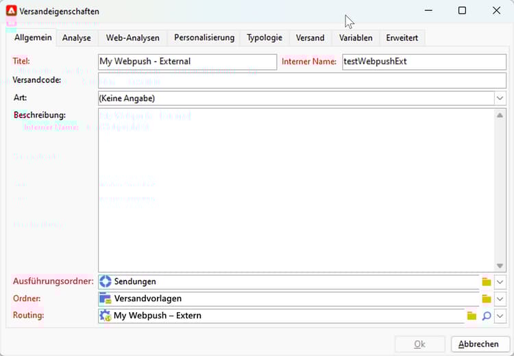 Erweitern Sie in der Client-Konsole das Versand-Schema mit allen zusätzlichen Eigenschaften, die für den benutzerdefinierten Kanal erforderlich sind.