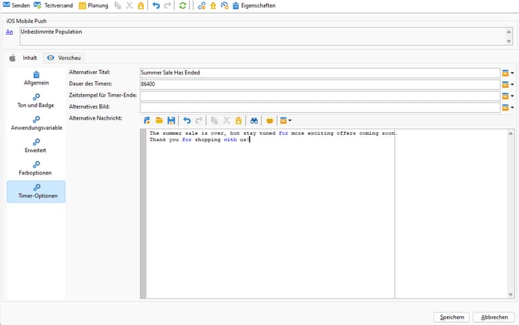 Geben Sie den Text und das Bild, die nach Ablauf des Timers angezeigt werden sollen, in die Felder Alternativer Titel, Alternative Nachricht und Alternatives Bild ein.