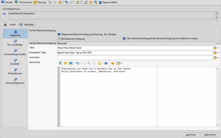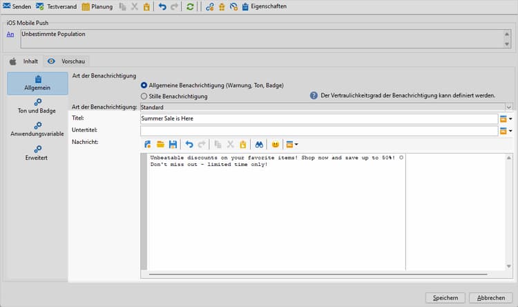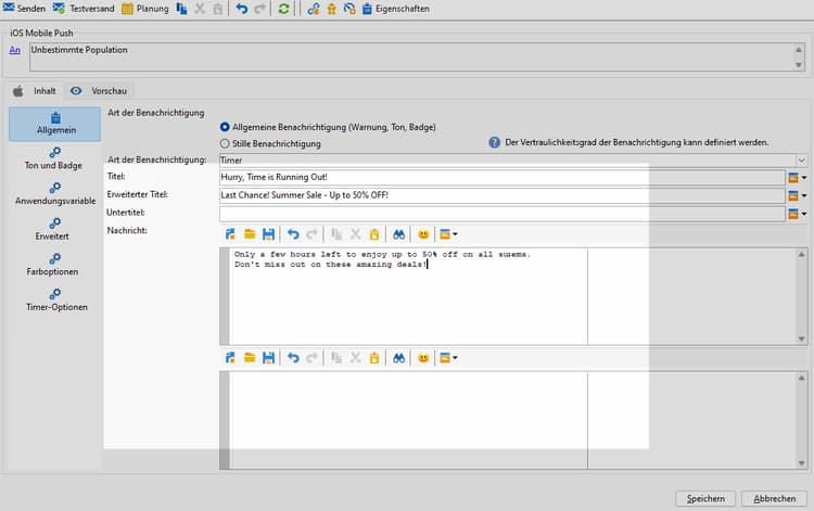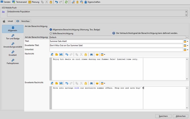 Um Ihre Nachricht zu erstellen, geben Sie Ihren Text in die Felder Titel, Erweiterter Titel, Nachricht und Erweiterte Nachricht ein.