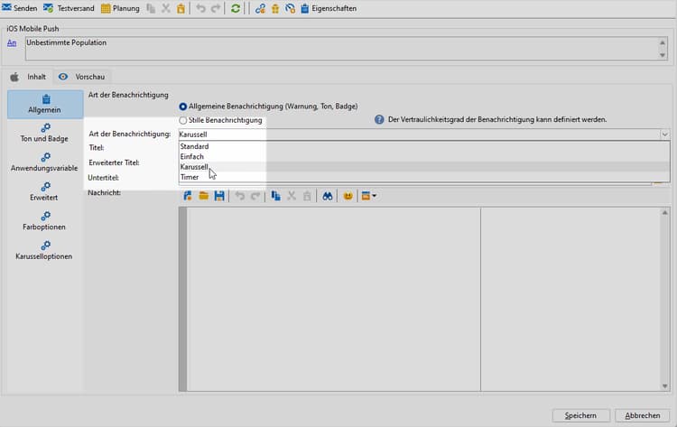 Wählen Sie aus der Dropdown-Liste Art der Benachrichtigung die Option Karussell aus.