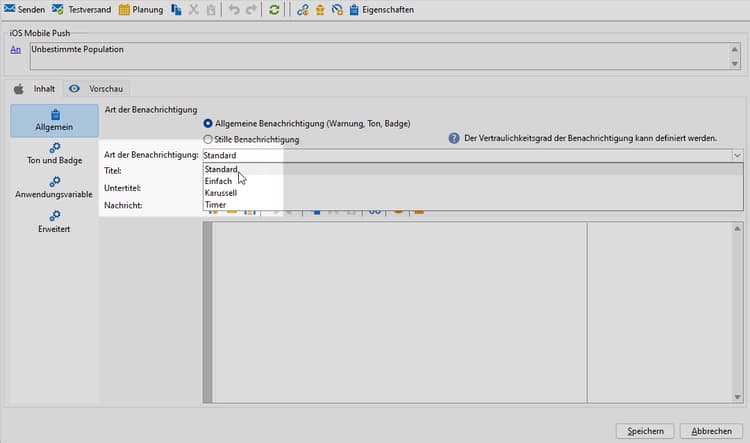 Sobald Ihr Push-Versand erstellt ist, können Sie seinen Inhalt mit einer der folgenden Vorlagen definieren: