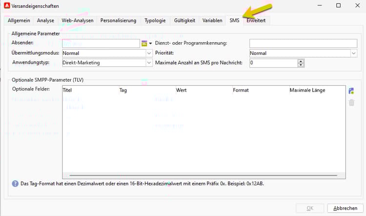 - Tag: der Tag-Wert im Dezimalformat (z. B. 12345) oder im Hexadezimalformat mit 0x-Präfix (z. B. 0x12ab). Tags können zwischen 0 und 65535 liegen. Fragen Sie den SMPP-Dienstleister, welche Tags unterstützt werden