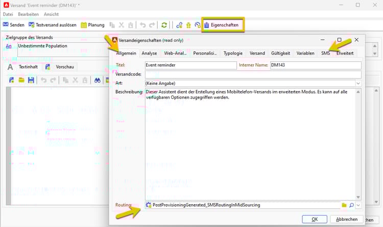 Sie können über die Schaltfläche Eigenschaften prüfen, ob alles nach Bedarf eingerichtet ist. Weitere Informationen zur Registerkarte „SMS“