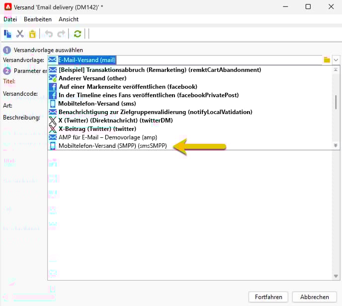 Erstellen Sie einen neuen Versand und wählen Sie die SMS-Versandvorlage aus, die Sie für Ihre SMS-Sendungen erstellt haben.