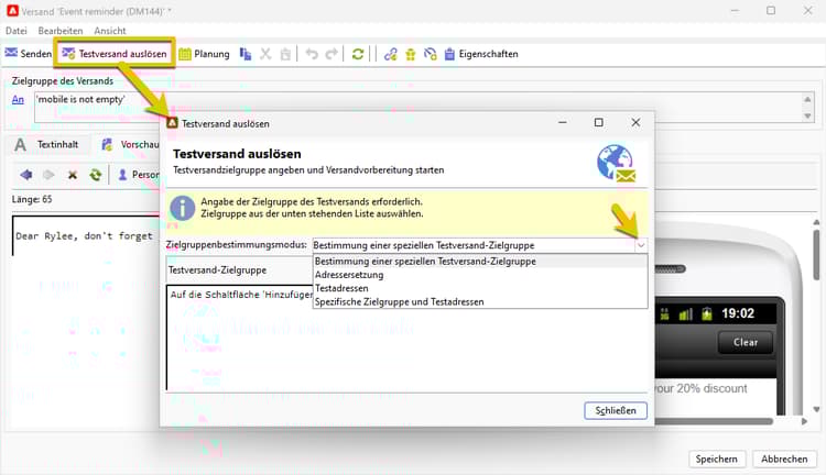 Sie können einen Testversand für Ihren SMS-Versand durchführen, um ihn zu validieren: