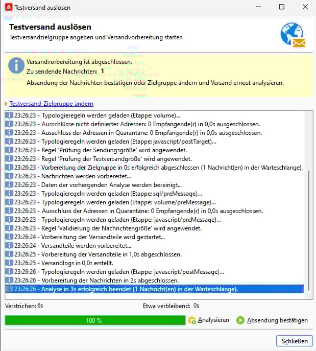 Klicken Sie dazu auf die Schaltfläche Testversand erzeugen. Daraufhin wird das folgende Fenster geöffnet: