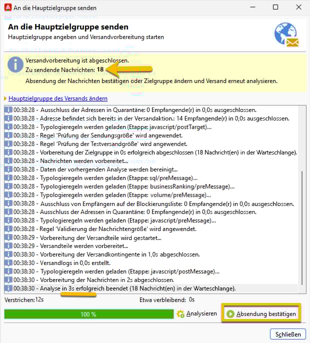 Adobe Campaign führt die gesamte Kontrolle aus, bevor der Testversand validiert wird. Es wird dabei der tatsächliche Umfang der Zielgruppe angezeigt. Am Ende der Analyse kann auf die Schaltfläche Absendung bestätigen geklickt werden.