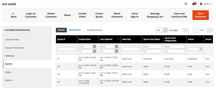 Wechseln Sie in der Admin-Liste zum Quotes Raster, indem Sie Sales auswählen, und wählen Sie dann Quotes aus.
