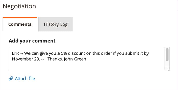 Fügen Sie auf der Registerkarte Negotiation - Comments einen Hinweis hinzu und fügen Sie alle unterstützenden Dateien hinzu, die für den Käufer erforderlich sind.