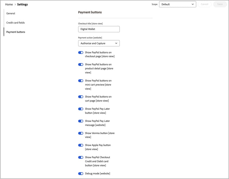 Aktivieren oder deaktivieren Sie die Zahlungsoption Venmo, in der die Zahlungsschaltflächen angezeigt werden. Optionen: Yes / No