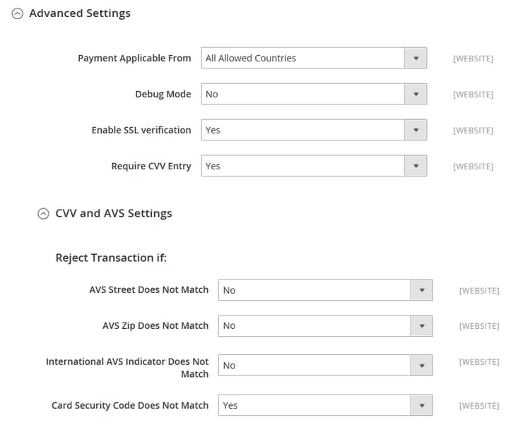 Authorization- Genehmigt den Kauf, setzt jedoch die Mittel zurück. Der Betrag wird erst abgehoben, wenn er vom Händler „eingezogen“ wurde.Sale - Der Betrag des Kaufs wird autorisiert und sofort vom Konto des Kunden zurückgezogen.American Express (erfordert eine zusätzliche Vereinbarung) / Visa / MasterCard / Discover / JCBAdvanced Settings