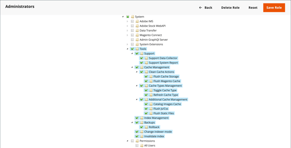 Sie können Benutzern nach Rolle Zugriff auf bestimmte Cache-Wartungsaktionen zuweisen, einschließlich Optionen zum Anzeigen, Umschalten und Leeren von Caches. Adobe empfiehlt, Löschaktionen nur für Benutzer auf Admin-Ebene zu aktivieren. Die Bereitstellung des Zugriffs auf alle Cache-Management-Funktionen kann die Leistung Ihrer Storefront beeinträchtigen.