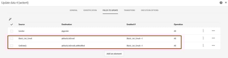 Anwendungsfall: Beim Importieren von Profilen aus einer Datei ist eine der wichtigsten Eigenschaften, die aus der Datei gelesen werden, blacklistEmail. Wie unten gezeigt, wenn Sie eine bedingte Aktualisierung für das Quellfeld verwenden, um unnötige Aktualisierungen des Zielfelds zu vermeiden.