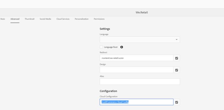 Um dieses Problem zu beheben, konfigurieren Sie die Commerce-Cloud-Konfiguration im Feld „Cloud-Konfiguration“ auf der Registerkarte „Erweitert“ in den Seiteneigenschaften, wie im folgenden Screenshot gezeigt.