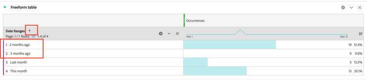 Wenn jemand die Dimensionen für den Datumsbereich in der Reihenfolge Diesen Monat nächsten Letzten Monat Nächste 2 Monate vor Nächste 3 Monate vor, aber durch Klicken auf das Sortiersymbol wird es in anderer Reihenfolge angezeigt.