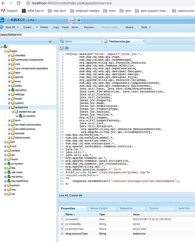 - Erstellen Sie einen Ordner testservice unter /apps und fügen Sie sling:resourceType mit testservice hinzu und erstellen Sie eine JSP-Datei mit dem Namen testservice.jsp, wie unten gezeigt: (Hinweis: Im Falle eines OAuth-Flusses stellen Sie sicher, /j_security_check?config=