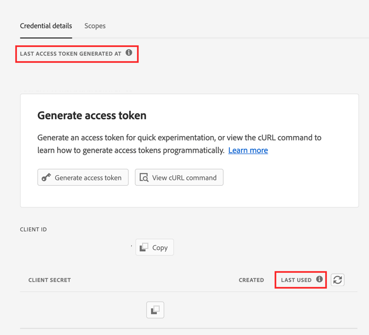 Überprüfen Sie den Zeitstempel des zuletzt verwendeten Zugriffs oder Menüs, um die von der Benutzeranwendung generierten Zugriffstoken mit den neuen Anmeldeinformationen zu überprüfen.