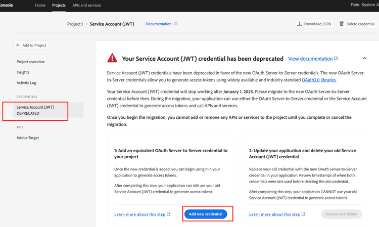 Die Anmeldedaten für Service-Konten (JWT) wurden zugunsten der neuen OAuth-Server-zu-Server-Anmeldedaten eingestellt. Die neuen Anmeldedaten erleichtern Ihnen die Entwicklung und Wartung von Adobe-Programmen. Außerdem entfällt die Notwendigkeit, Zertifikate regelmäßig zu rotieren, und es funktioniert sofort mit standardmäßigen OAuth2-Bibliotheken.