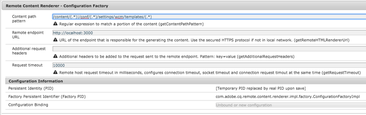 Dies geschieht über den RemoteContentRenderer – Configuration Factory OSGi-Service. Suchen Sie in der Konsole „Web-Konsolen-Konfiguration“ unter http://<host>:<port>/system/console/configMgr nach der Zeichenfolge „RemoteContentRenderer“.