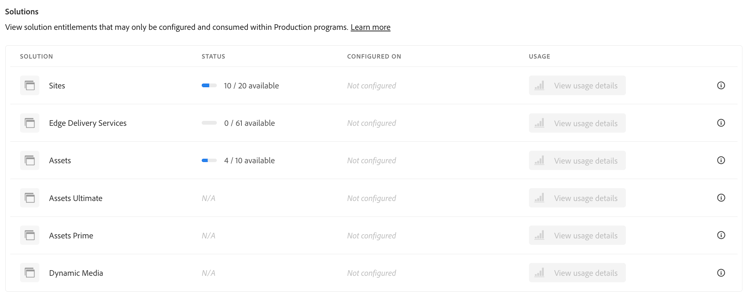 Lösungen: Die von Ihnen lizenzierten Lösungen. Beispielsweise Sites, Edge Delivery Services, Assets u. a.