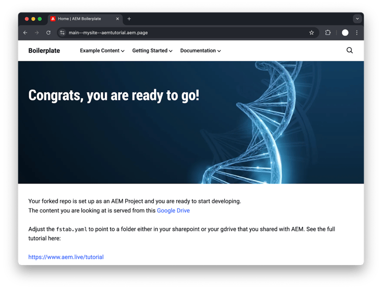 Herzlichen Glückwunsch! Es gibt eine neue Website, die auf https://<branch>--<repo>--<owner>.aem.page/ ausgeführt wird. Im obigen Beispiel ist dies https://main–mysite–aemtutorial.aem.page/