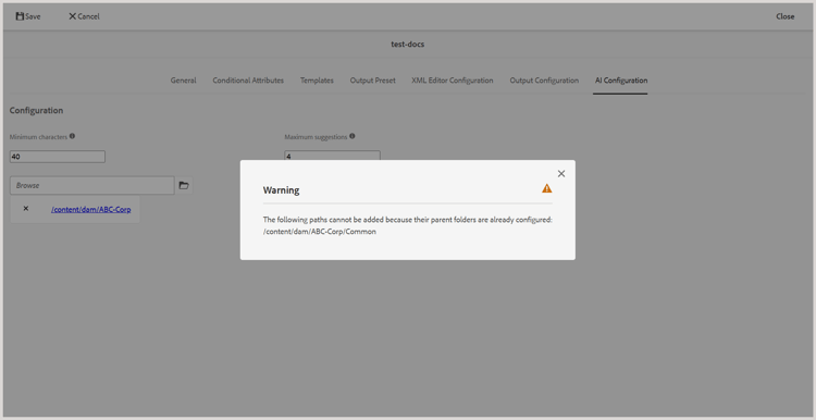 Sie können die KI-gestützten intelligenten Vorschläge konfigurieren und den Autoren dabei helfen, den vorhandenen Inhalt wiederzuverwenden und einfach richtige und konsistente Inhaltsreferenzen zu erstellen. Auf der Registerkarte KI Konfiguration“ können Sie die Einstellungen von Wiederverwendbare Inhalte vorschlagen über das Bedienfeld KI-Assistent im Editor steuern.