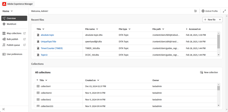 Einführung in die Startseite: Experience Manager Guides bietet jetzt eine Startseite, die einen intuitiven Willkommensbildschirm bietet, einschließlich einer Schnellansicht der Dateien, auf die Sie kürzlich zugegriffen haben, der Sammlungen und mehr.