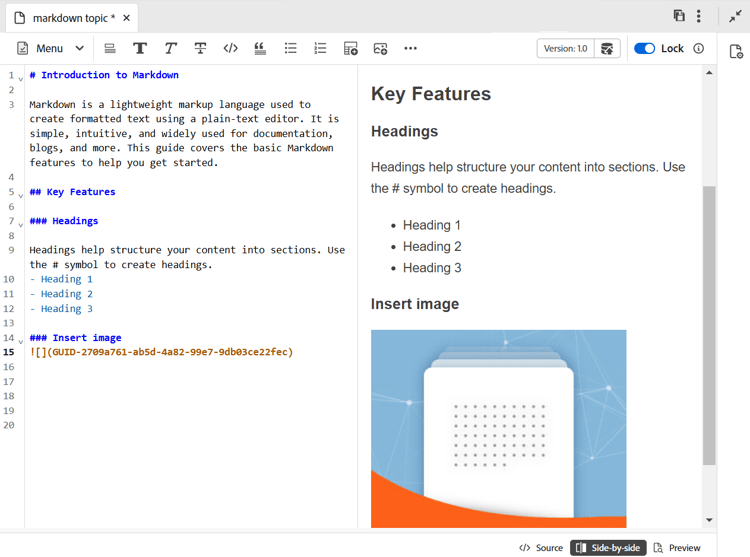 Erleben Sie jetzt eine sauberere, effizientere und leistungsfähigere Möglichkeit, Markdown-Themen zu erstellen. Experience Manager Guides führt eine neue Markdown-Editor-Oberfläche mit einer gut organisierten Symbolleiste und erweiterten Funktionen ein, einschließlich einer Ansicht Seite an Seite, um Inhalte gleichzeitig zu erstellen und in der Vorschau anzuzeigen. Außerdem wird die nahtlose Veröffentlichung von Markdown-Themen, die Teil einer Zuordnung sind, auf mehreren Kanälen ermöglicht.