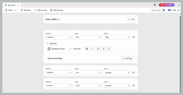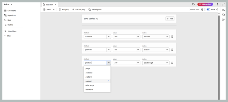 Autor: Dies ist eine typische Ansicht von What You See Is What You Get (WYSISYG) des DITAVAL-Editors. Sie können Eigenschaften über die einfache Benutzeroberfläche hinzufügen oder entfernen, über die die Eigenschaften, ihre Werte und Aktionen in der Dropdown-Liste angezeigt werden. In der Autorenansicht haben Sie die Möglichkeit, eine einzelne Eigenschaft einzufügen und alle Eigenschaften mit einem Klick einzufügen.