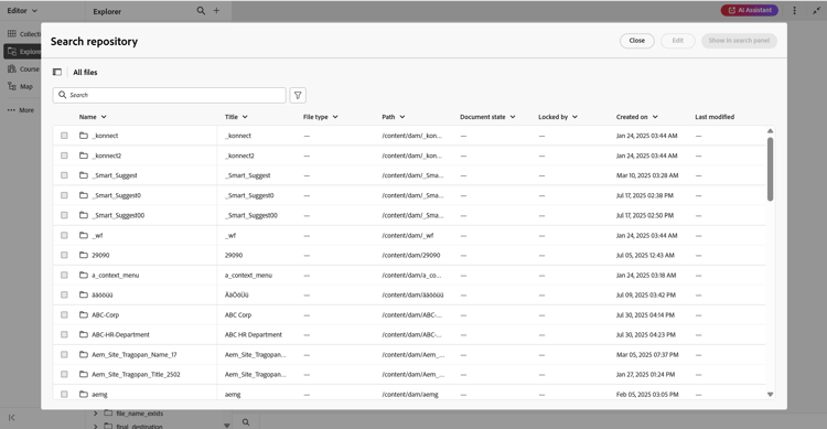 Wählen Sie das Suche-Symbol oben rechts im Explorer-) oder das Suchen-Symbol unten links im Inhaltsbearbeitungsbereich. Dadurch wird das Dialogfeld Repository suchen geöffnet, das dasselbe Such- und Filtererlebnis bietet wie die Repository-Benutzeroberfläche auf der Startseite.