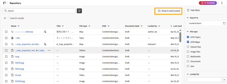 Wenn Sie eine Suche durchführen und Filter in der Repository-Oberfläche auf der Startseite anwenden, werden Sie durch Auswahl von Im Suchbereich anzeigen zur Editor-Oberfläche weitergeleitet. Alle Ihre Suchergebnisse werden im Suchbereich am unteren Rand der Editor-Benutzeroberfläche gespiegelt.