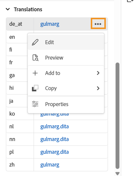 Für jede Sprachkopie können Sie den Mauszeiger über die Datei bewegen, um deren Pfad im Repository zu suchen, oder sie einfach auswählen, um sie im Editor zu öffnen. Neben dem Öffnen von Dateien können Sie auch viele Aktionen über das Menü Optionen im Abschnitt Übersetzungen durchführen. Zu den Aktionen, die Sie ausführen können, gehören Bearbeiten, Vorschau, UUID kopieren, Pfad kopieren, Zu Sammlungen hinzufügen und Eigenschaften.