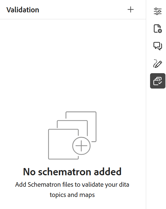 Wenn Sie ein Thema im Editor öffnen, wird rechts ein Bedienfeld für die Schematronvalidierung angezeigt. Führen Sie die folgenden Schritte aus, um ein Thema oder eine Zuordnung mit einer Schematron-Datei hinzuzufügen und zu validieren: