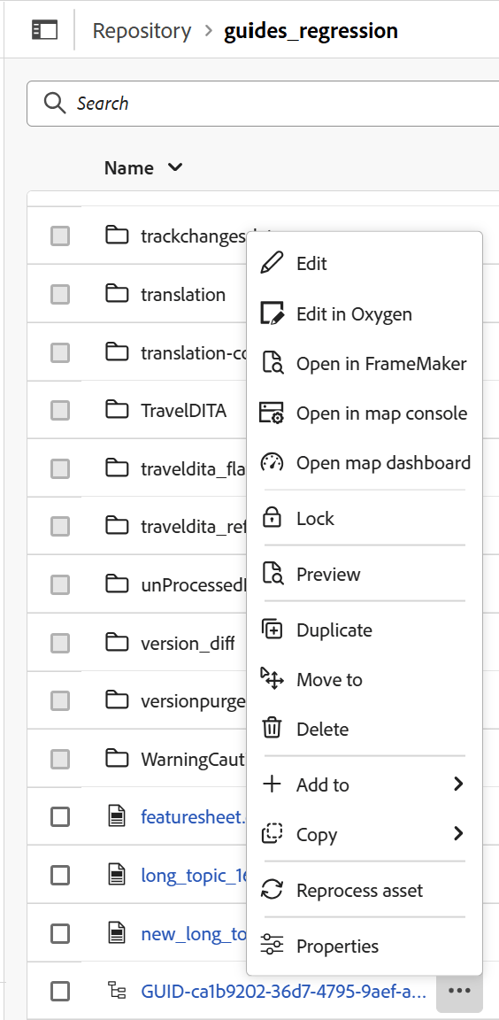In Map-Konsole öffnen: Falls die ausgewählte Datei eine DITA-Map ist, wird mit dieser Option die Map-Konsole geöffnet.