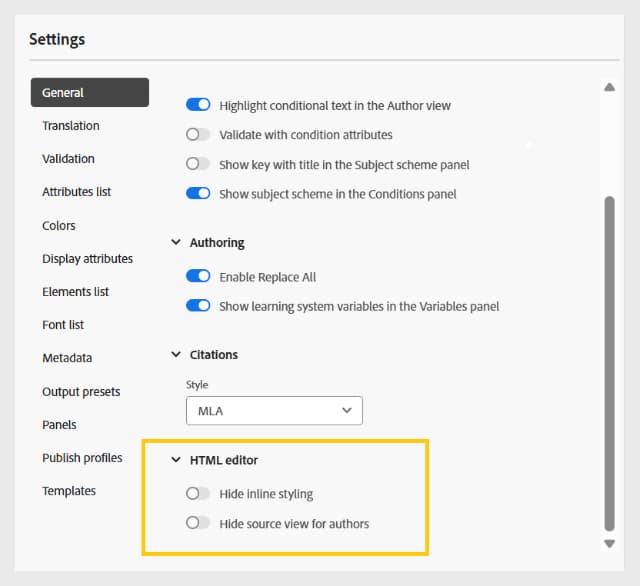 Mit dieser Einstellung können Sie den Editor für das HTML-basierte Authoring konfigurieren. Die wichtigsten Konfigurationsoptionen in dieser Einstellung sind: