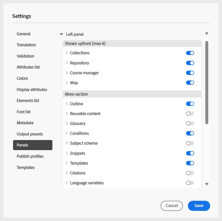 Mit dieser Einstellung werden die Bedienfelder gesteuert, die im linken und rechten Bedienfeld des Editors und der Zuordnungskonsole in Experience Manager Guides angezeigt werden. Sie können die Schaltfläche umschalten, um das gewünschte Bedienfeld ein- oder auszublenden.