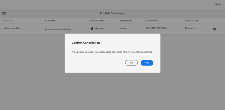 Experience Manager Guides bietet Publishern eine einfache Möglichkeit, laufende Veröffentlichungsaufgaben abzubrechen. Als Herausgeber können Sie eine laufende Veröffentlichungsaufgabe über die DITA Map-Konsole oder das Dashboard veröffentlichen“ .