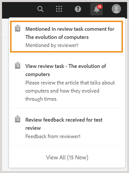 note note NOTE Sie können den Link zur Themenüberprüfung auch über den Bereich Benachrichtigungen im Posteingang in der Benutzeroberfläche von Adobe Experience Manager aufrufen. -