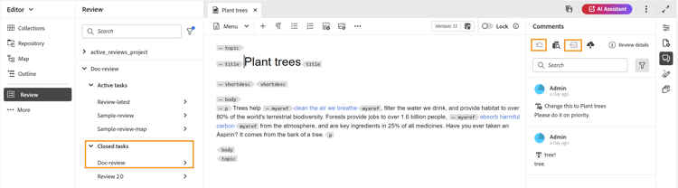 Daher können Sie sowohl als Prüfer als auch als Autor den überprüften Inhalt zusammen mit den Kommentaren anzeigen, jedoch keine Änderungen an einer abgeschlossenen Prüfungsaufgabe vornehmen.