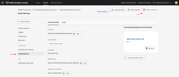Um Anmeldedaten für ein AEM-API zu entfernen, wählen Sie das API im Abschnitt APIs Ihres ADC-Projekts aus und klicken Sie dann auf Delete credential (Anmeldedaten löschen).