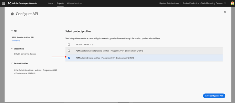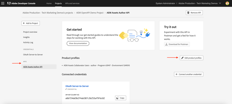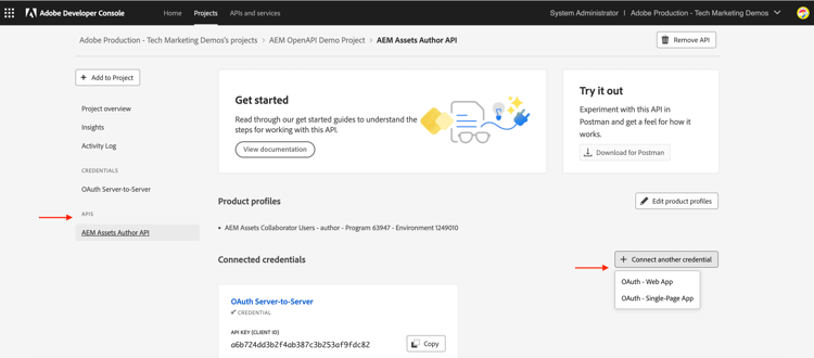 Wenn Sie ein AEM-API verwenden, müssen Sie die Anmeldedaten und das Produktprofil im Adobe Developer Console(ADC)-Projekt definieren. Im folgenden Screenshot sehen Sie die Anmeldedaten und das Produktprofil für ein AEM Assets Author-API: