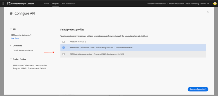 Um Produktprofile für ein AEM-API hinzuzufügen, klicken Sie im Abschnitt APIs des ADC-Projekts auf Edit product profiles (Produktprofile bearbeiten), wählen Sie im Dialogfeld Configure API (API konfigurieren) das gewünschte Produktprofil aus und speichern Sie Ihre Änderungen.