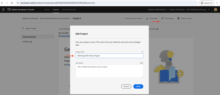 Bearbeiten Sie den Projektnamen, indem Sie oben rechts auf die Schaltfläche Edit project (Projekt bearbeiten) klicken. Geben Sie einen aussagekräftigen Namen ein und klicken Sie auf Save (Speichern).